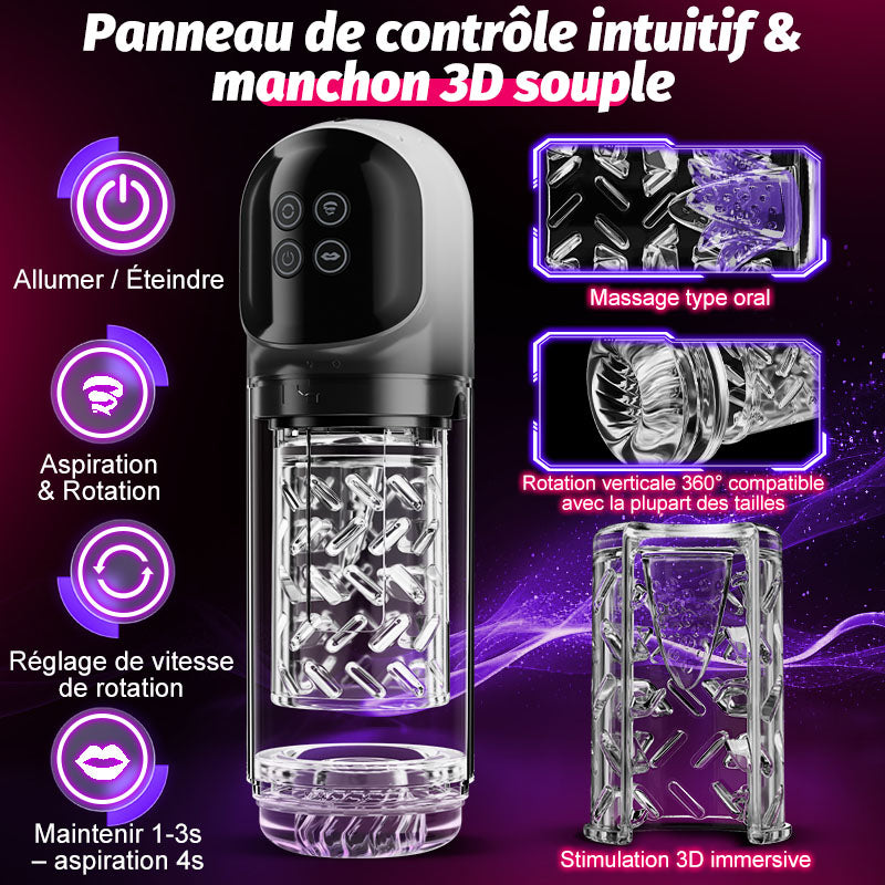 Délice multisensoriel : Plongez dans un monde de sensations grâce à l'aspiration, la rotation, la pulsation et le lapping, le tout dans un seul masturbateur. Savourez un concert charnel de sensations orales et pénétrantes qui imitent la ferveur de l'intimité humaine.